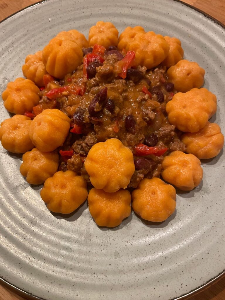 Ze všech surovin vypracujeme těsto a mouku přidáváme podle potřeby, dokud nebude těsto pevné. Následně tvoříme kuličky, hodně kuliček… Pak pomocí špejle dotvarujeme malé dýně a vaříme v osolené vodě s máslem, dokud nevyplavou na hladinu. Podáváme třeba s hovězím na zelenině.