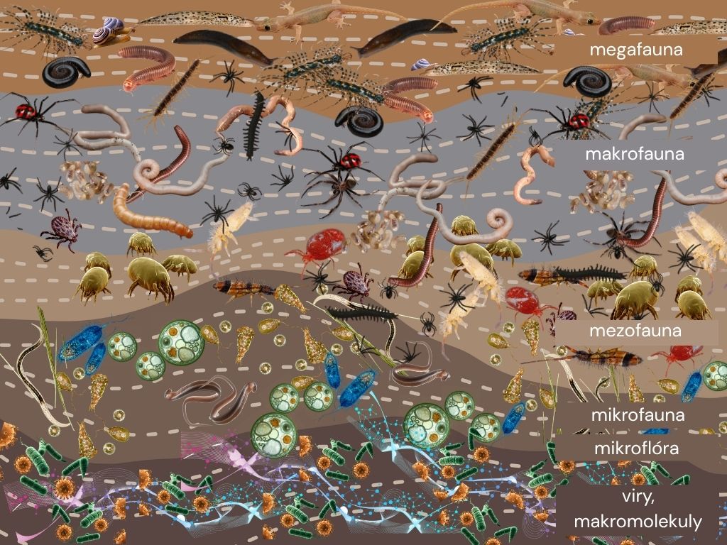 Ve skutečnosti je to tak, že půda je jedna velká zoologická zahrada. Takové ty velké breberky, co vidíte, například žížaly, pavouky a různé brouky, to je jenom malá část půdního života. Ta největší část není vůbec vidět. Je to půdní mikrobiom.